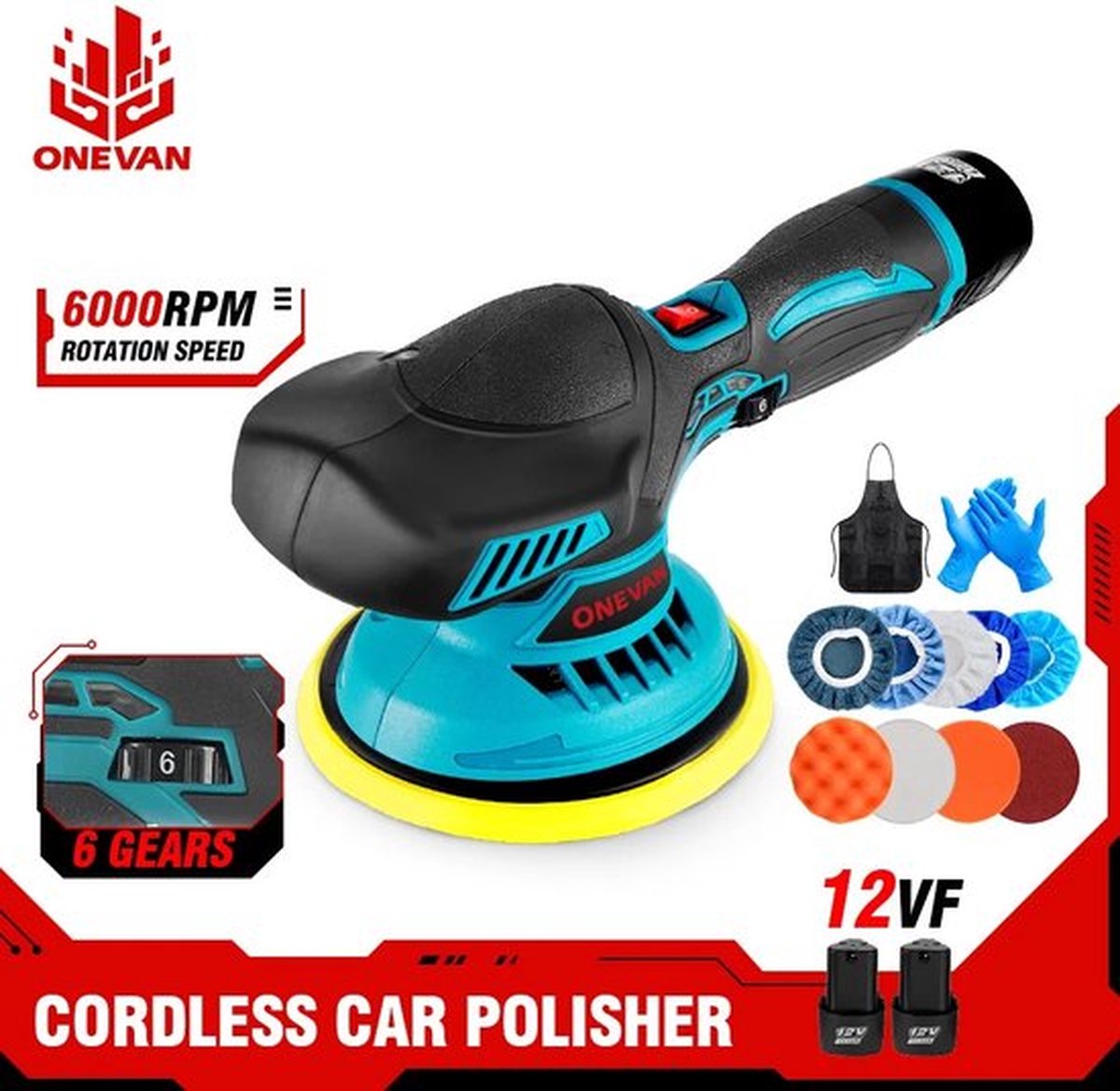Onevan Draadloze Auto Polijstmachine – 6 Snelheden, 6000 RPM, 12VF, Inclusief Accessoires