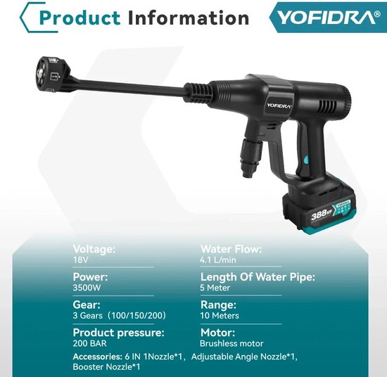 Yofidra - Hogedrukreiniger Accu - Draadloze Hogedrukreiniger - 200 Bar - 3500W